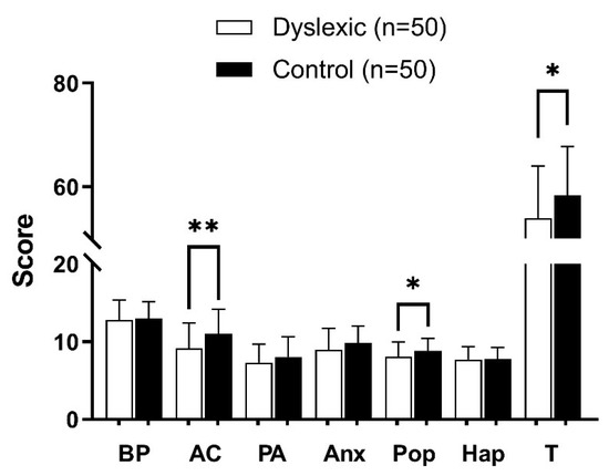 Difference in self-concept score between dyslexic group and control group. Abbreviations: BP, behavior problems; AC, academic competence; PA, physical appearance; Anx, anxious; Pop, popularity; Hap, happiness; T, total self-concept. Note: * p < 0.05; ** p < 0.01.