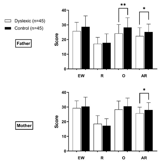 Difference of parental rearing style between dyslexic group and control group. Abbreviations: EW, emotional warmth; R, rejection; O, overprotecting; AR, anxious rearing. Note: * p < 0.05; ** p < 0.01; This part of the data analysis excluded children from a single parent family.