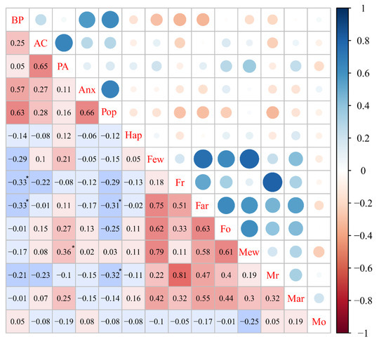 The relationship between self-concept and parental rearing style in the dyslexic group. Abbreviations: BP, behavior problems; AC, academic competence; PA, physical appearance; Anx, anxious; Pop, popularity; Hap, happiness; Few, father’s emotional warmth; Fr, father’s rejection; Far, father’s anxious rearing; Fo, father’s overprotection; Mew, mother’s emotional warmth; Mr, mother’s rejection; Mar, mother’s anxious rearing; Mo, mother’s overprotection. Note: * p < 0.05; Red for positive correlation, blue for negative correlation; the stronger the correlation, the darker the color.