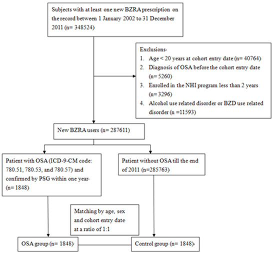 New users of BZRAs who had been diagnosed with OSA (defined by index date) in the follow-up period were selected as the OSA group. New users of BZRAs without a diagnosis of OSA in the whole follow-up period were selected as the control group. Each control was selected from the same database and matched by age, sex, and index date at a ratio of 1:1.
