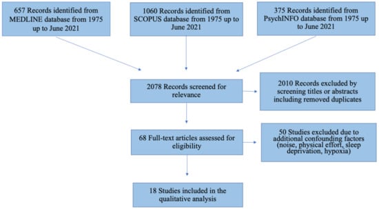 The literature search retrieved 657 (Pubmed), 1060 (Scopus), and 375 (PsycINFO) articles evaluating the effect of cold exposure on cognitive performance. A total of 68 articles were retrieved for full-text review of which 18 were selected and included based on the inclusion criteria (Figure 1). Studies were published between 1975 and 2021.