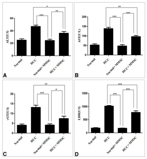 The serum level of (A) alanine transaminase (ALT), (B) aspartate aminotransferase (AST), (C) gamma glutamyltransferase (γGT), and (D) lactate dehydrogenase (LDH). Data were presented as mean ± SEM. * Significantly different at p < 0.05 using ANOVA followed by Bonferroni’s as a post-hoc test, ** Significantly different at p < 0.001, *** Significantly different at p < 0.0001, ≠ no significantly difference using ANOVA followed by Bonferroni’s as a post-hoc test. Hepatocellular carcinoma (HCC), S-methylmethionine sulfonium chloride (MMSC).