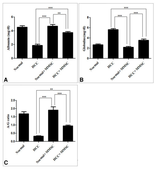 The serum albumin level and A/G ratio were significantly decreased (p < 0.05) in the HCC-induced group in comparison with those in the normal group and the MMSC normal treated group. Interestingly, the MMSC administration to HCC rats significantly increased (p < 0.05) the serum albumin level and A/G ratio compared with the HCC group. Furthermore, there were no significant differences in the serum albumin level and A/G ratio between the untreated normal group and the MMSC-treated normal group, as shown in Figure 2A,C. In contrast, the serum globulin was significantly elevated (p < 0.05) in the HCC group compared with that in the untreated normal group and MMSC-treated normal group. Meanwhile, the MMSC treatment after HCC induction significantly decreased (p < 0.05) the serum globulin and restored nearly up to the basal level in comparison with that in the HCC-induced group, as shown in Figure 2B.