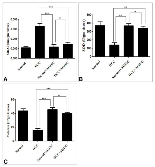 The hepatic MDA activity was significantly increased (p < 0.05). Moreover, the hepatic activities of SOD and CAT were significantly decreased (p < 0.05) in the HCC induction group in comparison with those in the untreated normal group and MMSC-treated normal group. Likewise, the MMSC administration after the HCC induction group significantly decreased (p < 0.05) the MDA activity, increased the SOD and CAT activity, and restored nearly up to the basal activity, compared with the HCC-only induced group. There were no significant differences between MDA, SOD, and CAT activities for the MMSC-treated normal group and the untreated normal group (Figure 3).