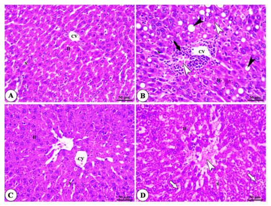 The liver tissue of different groups was processed and sectioned for histopathology analysis. The procedure can be summarized briefly as follows: after fixation of liver tissue in formalin 10%, the sample was dehydrated in various alcohol concentrations, washed in xylene, and embedded in paraffin blocks. The sectioning was made with 5 µm thickness and was stained with hematoxylin and eosin (H&E) [31]. The digital camera computer interface (Nikon digital camera, Shinagawa-ku, Tokyo, Japan) was used to photograph histological changes in the liver tissue under a light microscope.
