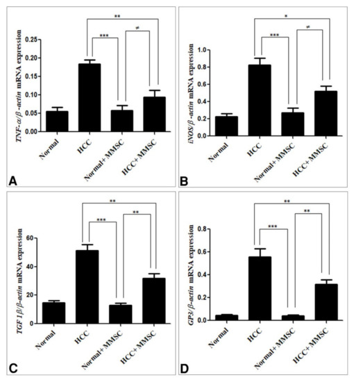 mRNA expression of genes (A) TNF-α, (B) iNOS, (C) TGF-β1, and (D) GP3 in liver tissues. The mRNA expression levels were measured by qRT-PCR and normalized to β-actin binding protein. The following primer sets were used for the detection (Table 1). Data are the mean ± SEM. * Significantly different at p < 0.05 using ANOVA followed by Bonferroni’s as a post-hoc test, ** Significantly different at p < 0.001, *** Significantly different at p < 0.0001, ≠ no significantly difference using ANOVA followed by Bonferroni’s as a post-hoc test. Hepatocellular carcinoma (HCC), S-methylmethionine sulfonium chloride (MMSC).