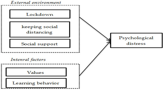 This article will attempt to overcome the shortcomings of the single psychological perspective that emerged in the past, and then analyze the social and cultural factors associated with psychological distress by a new analytical framework (Figure 1). In this framework, the psychological distress of international students is the result of a combination of the external environment (including lockdown, social distancing, and social support) and internal factors such as values and behavior. This will contribute to a more comprehensive understanding of the causes of psychological distress from multiple perspectives.