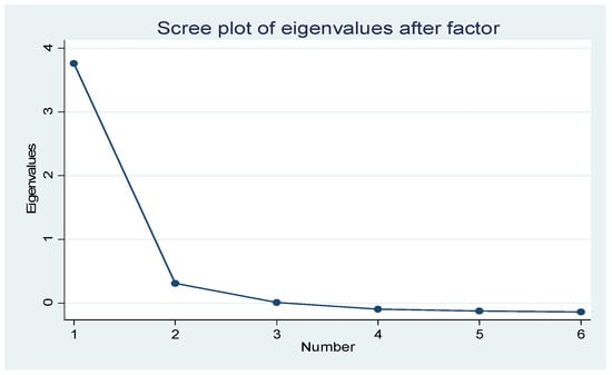 In order to test the robustness of the above analytical results, we used another method to construct the dependent variable, psychological distress, and then rebuilt the models again. We sought to extract the factors associated with the six items of the scale by using exploratory factor analysis. The previous analysis showed that the reliability was good and the internal consistency was also high (Cronbach’s alpha = 0.9089), and the Kaiser–Meyer–Olkin value was 0.8744 (p < 0.000), which indicated that these items were suitable for exploratory factor analysis. Therefore, we conducted exploratory factor analysis by principal component and varimax rotation. From the results of Table 4 and Figure 2, we can see that only the eigenvalue of factor 1 was larger than 1, which shows that only one factor could be extracted. Thus, we extracted this factor and referred to it as psychological distress according to the correlation of the indicators and their meanings. The factor score was saved as the dependent variable.