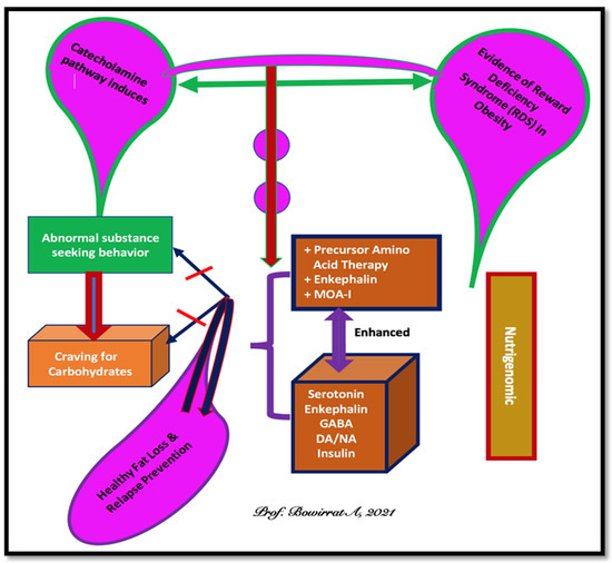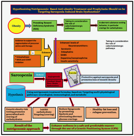 Background: The United States Centers for Disease Control and Prevention (CDC) estimates a total obesity rate of 30% for 12 states and a 20% obesity rate nationwide. The obesity epidemic continues to increase in spite of preventative measures undertaken worldwide. Pharmacological treatments promise to reduce total fat mass. However, medications may have significant side effects and can be potentially fatal. Data Retrieval: This brief review, based on a PUBMED search of the key terms “Obesity” and” Sarcopenia,” will present evidence to corroborate the existence of Reward Deficiency Syndrome (RDS) in obesity and the involvement of catecholaminergic pathways in substance seeking behavior, particularly as it relates to carbohydrates cravings. Expert Opinion: The genetic basis and future genetic testing of children for risk of aberrant generalized craving behavior are considered a prevention method. Here we present evidence supporting the use of precursor amino acid therapy and modulation of enkephalinase, MOA, and COMT inhibition in key brain regions. Such treatments manifest in improved levels of dopamine/norepinephrine, GABA, serotonin, and enkephalins. We also present evidence substantiating insulin sensitivity enhancement via Chromium salts, which affect dopamine neuronal synthesis regulation. We believe our unique combination of natural ingredients will influence many pathways leading to the promotion of well-being and normal healthy metabolic functioning. Sarcopenia has been shown to reduce angiogenesis and possible cerebral blood flow. Exercise seems to provide a significant benefit to overcome this obesity-promoting loss of muscle density. Conclusion: Utilization of proposed nutrigenomic formulae based on coupling genetic obesity risk testing promotes generalized anti-craving of carbohydrates and can inhibit carbohydrate bingeing, inducing significant healthy fat loss and relapse prevention.