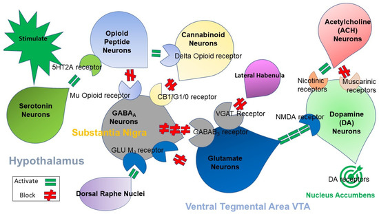 Figure 3 illustrates the interaction of at least six major neurotransmitter pathways involved in the Brain Reward Cascade (BRC). In the hypothalamus, environmental stimulation causes the release of serotonin, which in turn, via, for example, 5HT-2a receptors, activate (green equal sign) the subsequent release of opioid peptides from opioid peptide neurons, also in the hypothalamus. Then, in turn, the opioid peptides having two distinct effects, possibly via two different opioid receptors: A) inhibits (red hash sign) through the mu opioid receptor (possibly via enkephalin) and projecting to the Substania Nigra to GABAA neurons B) stimulates (green equal sign) Cannabinoid neurons (e.g., Anandamide and 2-archydonoglcerol) through Beta–Endorphin linked delta receptors, which in turn inhibits GABAA neurons at the substania nigra. Cannabinoids primarily 2-archydonoglcerol, when activated, can also indirectly disinhibit (red hash sign) GABAA neurons in the Substania Nigra through activation of G1/0 coupled to CB1 receptors. Similarly, Glutamate neurons located in the Dorsal Raphe Nuclei (DRN) can indirectly disinhibit GABAA neurons in the Substania Nigra through activation of GLU M3 receptors (red hash sign). GABAA neurons, when stimulated, will, in turn, powerfully (red hash signs) inhibit VTA glutaminergic drive via GABAB 3 neurons. It is also possible that stimulation of ACH neurons that at the Nucleus Accumbens ACH can stimulate both muscarinic (red hash) or Nicotinic (green Hash). Finally, Glutamate neurons in the VTA will project to dopamine neurons through NMDA receptors (green equal sign) to preferentially release dopamine at the Nucleus Accumbens (NAc), shown as a bullseye indicating euphoria (a wanting response). The end result is that as dopamine is released (low = unhappiness-endorphin deficiency) and (normal = happiness), depends on the happiness tonic set point [22] [With permission by Blum et al.].