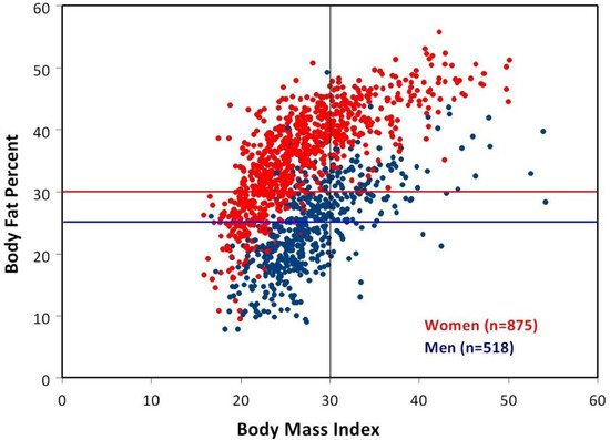 Women (red) who fall above the red line are obese according to the American Society of Bariatric Physicians criteria (DXA percent body fat: ≥30%). Men (blue) who fall above the blue horizontal line are obese according to the American Society of Bariatric Physicians criteria (DXA percent body fat: ≥25%). The upper left quadrant bordered by a red horizontal line (body fat percent = 30%) and black vertical line (BMI = 30) demonstrates the large number of women misclassified as “non-obese” by BMI yet “obese” by percent body fat [with permission from Shar and Braverman].