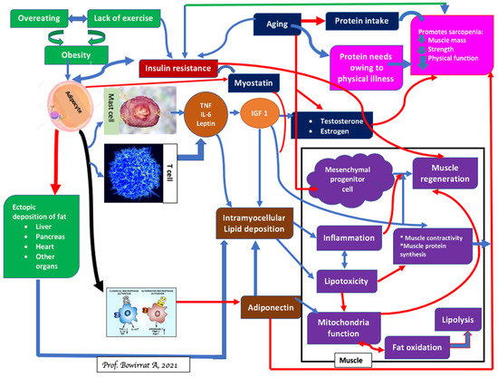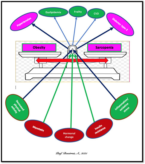 It is known that aging induces changes in body composition, such as an increase in visceral fat and reduced muscle mass. There is an emerging concept that sarcopenic obesity reflects the combination of Sarcopenia and obesity. Sarcopenia and obesity share several pathophysiological mechanisms, including the dangerous relationship between diminished muscle mass and strength in cardiometabolic disease mortality [73] (see Figure 4) [66].