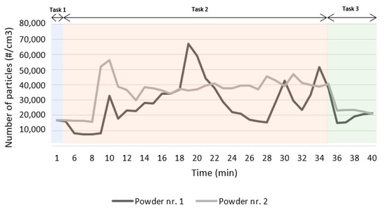 Observing the same table, it is possible to confirm that both trials produced similar results. In both cases, the highest mean particle number concentration was obtained during Task 2. Figure 3 shows that the highest value was measured during this task, inside the machine operating area, while the worker removes and cleans the metal part. For Task 2, the mean value measured exceeds more than twice the background levels, being higher when printing with the cobalt–chromium–silicon–carbon alloy (presenting a 181% increase).