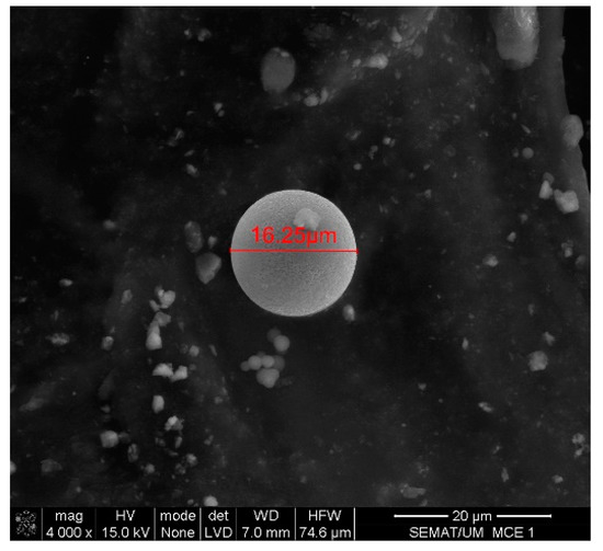 SEM detected medium-size particles (ranged from 1 to 100 μm), as shown in Figure 4 and Figure 7. These images reveal that the particles did not show any visible alteration to their size or surface (rugosity) after laser action.