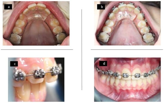 Upper occlusal photograph with fixed Austro Repositioner appliance (a), upper occlusal photograph with fixed Austro Repositioner appliance combined with braces (b), lateral anterior photo with fixed Austro Repositioner appliance combined with braces (c), and frontal photo with fixed Austro Repositioner appliance combined with braces (d).