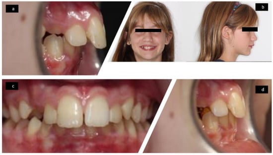 Photographs at T1: lateral intraoral without Austro Repositioner appliance (a), frontal and lateral facial (b), frontal intraoral (c), lateral intraoral with Austro Repositioner appliance (d).