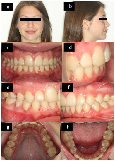 Photographs at T2: frontal facial (a), lateral facial (b), frontal intraoral (c), lateral anterior intraoral (d), right lateral intraoral (e), left lateral intraoral (f), upper occlusal (g), and lower occlusal (h).