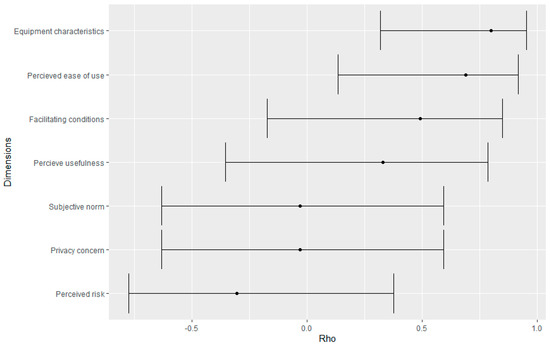 Figure 1 shows the correlation between the questionnaire’s dimensions and the acceptability of the device. Three dimensions (equipment characteristics, perceived ease-of-use and facilitating conditions) seem to be more correlated than the remaining four (perceived usefulness, subjective norm, privacy concerns, and perceived risks) with the acceptability level.