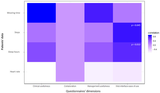 Observing the correlation between professionals’ impressions (i.e., professionals answers to questionnaire items grouped in the four dimensions) and patients’ data collected by the devices, all dimensions seem to be inversely correlated with the median heart rate and, to a lesser extent, with the wearing time (Figure 2). Conversely, all dimensions are more correlated with the other patients’ data. In particular, we can also observe a good correlation (>0.5) between the dimensions of collaboration and web interface ease-of-use and patients’ median hours of sleep. Furthermore, there is a weak positive correlation between professionals’ questionnaire dimensions and patients’ median number of steps. The only two correlation coefficients which are statistically significant are those between web interface ease-of-use and sleep hours (p = 0.013) and number of steps (p = 0.045).