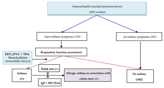 In a total of 1082 workers, 129 (11.9%) had suspected asthma symptoms, 80 (7.4%) were diagnosed with asthma, and 46 (4.3%) were diagnosed with cotton dust-related allergic asthma.