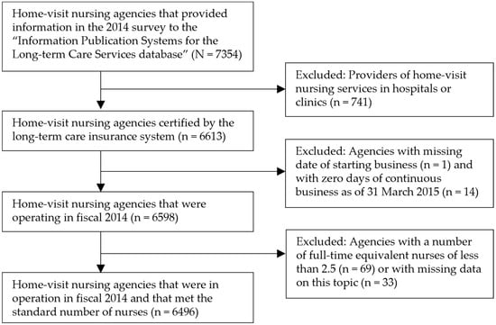 The data included information on the opening date, location, agency ownership, service content, number of users, and number of staff. We collected published information on the VNAs in Japan from 2014 to 2017 in this study. Particularly, we created a panel database (N = 7354) combining VNA information for each year according to their business operator ID. The following were excluded from the database: hospitals or clinics providing home-visit nursing services; with missing information on the date they started their business; agencies that were registered but have failed to commence their operations as of March 31, 2015; agencies with less than 2.5 full time equivalent (FTE) nurses, and agencies with missing figures for FTE nurses. Finally, 6496 agencies were identified (Figure 1).