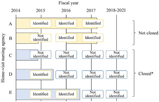 The local government has information on the closed VNAs. However, the list of closed VNAs has not been made public. Thus, in this study of the VNAs included in the 2014 publication of information through the LTC-DB, those that did not have the corresponding information between 2015 and 2017 were designated as “closed”. However, there was the possibility that some agencies considered as “closed” may not have registered their agency’s information for the years included in this investigation. Accordingly, we confirmed whether their information appeared in more recently published datasets using the information from the LTC-DB published online in 2018, 2019, and 2020 [] (see Figure 2 below).