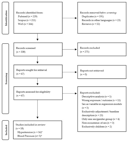 PRISMA Flow Diagram of the selection process of records regarding hypertension and blood pressure-changes. * Three studies investigated both outcomes hypertension and blood pressure-changes.