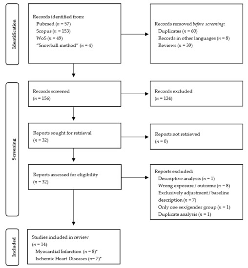 PRISMA Flow Diagram of the selection process of records regarding ischemic heart diseases and myocardial infarction. * One study investigated both outcomes ischemic heart diseases and myocardial infarction.