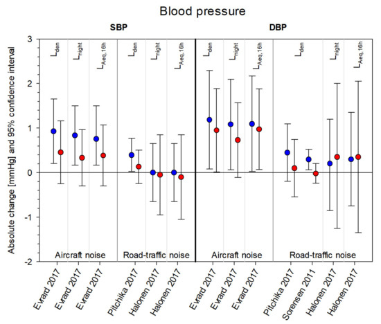 Sex/gender-specific effect estimates from studies with the cardiovascular outcome blood pressure changes. Effect estimates are displayed as absolute changes (mmHg) (blue = males, red = females) and 95% confidence intervals per 5 dB(A) increase in noise exposure (aircraft noise, road traffic noise) and grouped according to systolic and diastolic blood pressure changes (SBP, DBP) and noise indicator (Lden, Lnight, LAeq, 16 h). Please note, some studies provided several estimates for different noise indicators per noise exposure and frequency measure.
