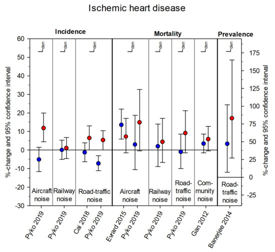 Supplementary Materials Tables S7–S9 comprise the original effect estimates from all 30 studies including those not reporting any effect sizes for one or both sex/gender groups and those reporting categorical effects, as well as calculated p-values for the difference between sex/gender-specific estimates [52]. The majority of estimates were received from studies concerning hypertension: sixteen studies provided 29 effect estimates for females and 28 effect estimates for males. For blood pressure changes, 26 effect estimates (13 each for males and females) were obtained from five studies. Twelve studies concerning ischemic heart disease provided 42 effect estimates (21 each for males and females). The effects were very heterogeneous, with no distinct pattern appearing with respect to noise sources. Only a few significant effects and an even smaller number of significant differences between the sex/gender groups (six for HT none for BP-changes, two for IHD, and none for MI) were found.