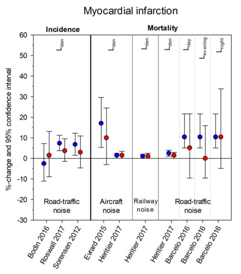 - Bodin, T.; Bjork, J.; Mattisson, K.; Bottai, M.; Rittner, R.; Gustavsson, P.; Jakobsson, K.; Ostergren, P.O.; Albin, M. Road traffic noise, air pollution and myocardial infarction: A prospective cohort study. Int. Arch. Occup. Environ. Health 2016, 89, 793–802. [Google Scholar] [CrossRef] [PubMed]