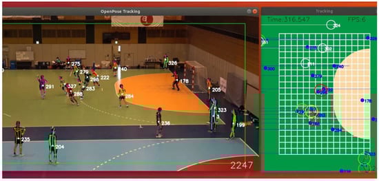 Real-time automated quantitative monitoring of social distancing with a motion image-based AI system, shown on Ubuntu 18.04.5 LST. This system identified participant positions using a function on OpenPose []. The distance between the players was calibrated based on known court geometry.