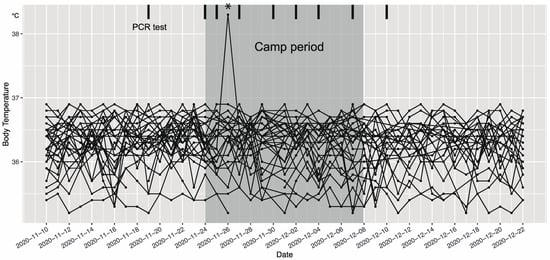 Body temperature chart line–scatter plot for all athletes. The darker grey shaded area is the camp period (15 days); thick vertical lines denote days on which PCR tests were performed; and the asterisk denotes the single febrile athlete recorded on day 3.