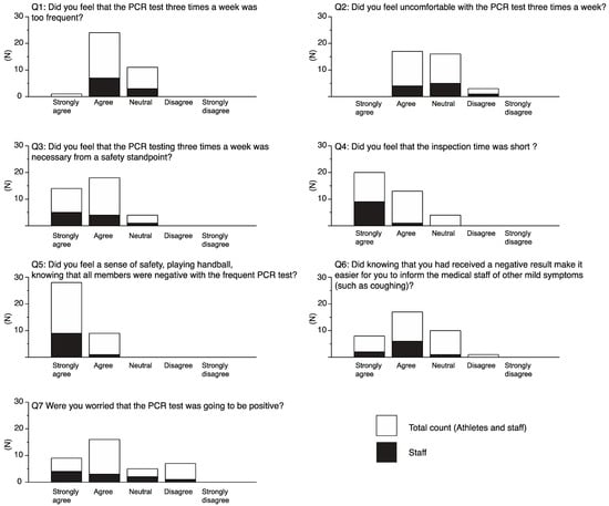 Results from the online questionnaire about infection test protocol were obtained from 27 athletes and 10 staff (Figure 3 Q1–Q7). Our survey suggested that most participants felt that three tests a week was too frequent (Q1) and were not compliant (Q2), but recognized the importance of high-frequency testing to maintain a safe training environment (Q3). The frequent testing with a short sample-to-answer time provided a strong sense of relief both to athletes and staff that helped them participate in the handball training sessions (Q4, Q5). Moreover, being aware of the negative results following every testing session increased their compliance in reporting minor symptoms (such as coughing) to the medical staff (Q6). Most participants felt anxious while waiting for the results on each test day (9 strongly agree and 16 agree); however, most appeared unconcerned about the PCR results (5 neutrals and 7 disagree, Q7).