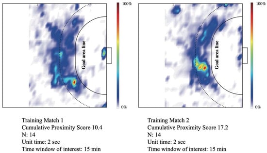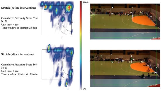 For the social distancing AI monitoring data, the total sum of the proximity points for all proximity ID pairs was normalized by the number of associated athletes and defined as the cumulative proximity score. The cumulative proximity score was normalized by two separate unit time (UT) scales to consider the effect of respiratory rate (RR) on physical activity, since the risk of virus spread is theoretically proportional to RR, which is increased by physical activity [,]. The UT roughly assumed a time needed for one respiratory cycle and was calculated based on the measured average HR at rest (about 60 bpm) and during a handball match (about 140 bpm) from the participant. Referring to Scholkmann et al. [], the ratio between the time needed for one heartbeat and that for one respiratory cycle is about 1:4. Thus, the UT (time needed for one respiratory cycle) was calculated as 60 s/60 bpm × 4 = 4 s while at rest and 60 s/140 bpm × 4 = 2 s while in training. The total time that was maintained continuously for each proximity ID served as a metric for proximity duration. With the aforementioned metrics in place, we evaluated two training matches (each lasting 15 min) held on 6 December 2020. Additionally, midway during the camp (day 5), the system identified that the stretching time (pregame) contributed to high proximity scores. We intervened and provided feedback to the teams to disperse during stretching time on the remaining days. Proximity scores are therefore described under results before (up to day 5) and after (day 6 onwards) trainers’ feedback. To visualize high-proximity locations on the handball court, a two-dimensional frequency histogram was visualized using the (x, y) position coordinate data of every proximity ID pair recorded during two training matches and stretching exercises. The spatial resolution for calculating two-dimensional histogram was set as 0.3 × 0.3 m squares. The visualization was performed with the Matlab function “densityplot”. Furthermore, based on the timestamp information, the continuous times of all proximity ID were calculated, and the frequency density of the proximity duration was compared between handball matches and stretching.