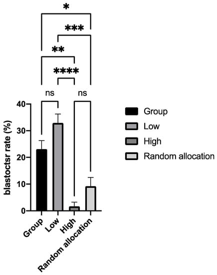 Bovine embryos that have a “lower” overall amino acid turnover produce significantly more blastocysts than to embryos with a “high” overall amino acid turnover. In order to complete this experiment, bovine embryos were cultured individually for 36h and prospectively allocated to a group based on whether their amino acid turnover was “high” or “low”. Two control groups were used; one where embryos were allocated randomly to groups after 36h individual culture and a second where embryos were maintained in group culture for the duration of the experiment. Stars indicate significant differences between groups (* p < 0.05; ** p < 0.01; *** p < 0.001; **** p < 0.0001). Redrawn from Sturmey et al. [123].