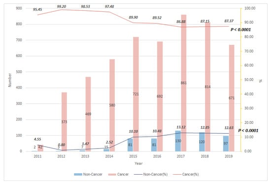 Trend of terminally ill cancer and non-cancer patients receiving PCCS from 2011 to 2019.