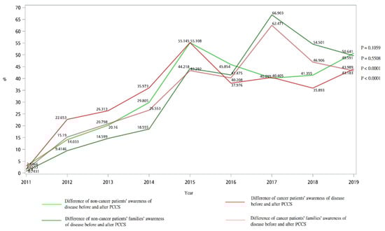 Difference of cancer and non-cancer patients’/families’ awareness of disease before and after PCCS from 2011 to 2019.