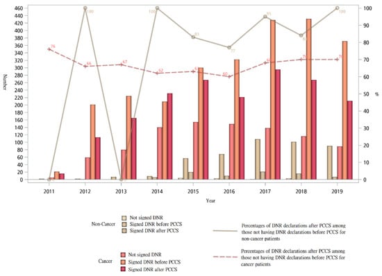 Trend of DNR declaration of terminally ill cancer and non-cancer patients receiving PCCS from 2011 to 2019.