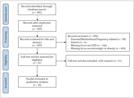 In total, 982 potential studies were identified in the initial search, of which 905 remained after duplicates had been removed. After screening titles and abstracts, 51 potential studies were retrieved for full-text analysis, of which 21 studies were excluded due to: main focus on the impact of overweight and obesity (n = 12), lacking focus on overweight and obesity (n = 5), focus on underweight (n = 1) and not exclusively assessing patients with CHD (n = 3). Finally, 30 studies with a total of 21,610 CHD patients met the inclusion criteria for this systematic review. The search algorithm and selection process is displayed in Figure 1.