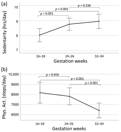 Repeated measures ANOVA indicated that levels of sedentary behavior increased significantly over the course of pregnancy (p < 0.001). Post-hoc tests indicated differences in mean sedentary behavior at 16–18 weeks versus at 24–26 and 32–34 weeks but no differences from 24–26 weeks and 32–34 weeks (Figure 1). Physical activity levels significantly decreased over the course of pregnancy. Post-hoc tests indicated no differences in mean physical activity at 16–18 weeks versus at 24–26 weeks but differences from 16–18 versus 32–34 weeks and 24–26 versus 32–34 weeks (Figure 1).