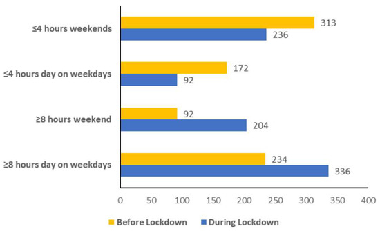 Number of participants sitting for ≤4 and ≥8 h per day on weekdays and weekends before and during lockdown.