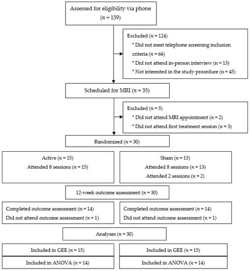 Generalized Estimating Equations (GEE) with an unstructured (general) correlation matrix were used to analyze changes in steps per day [73,74]. GEE was selected because it controls for highly correlated repeated-outcome measures, such as steps per day. Condition (active or sham) was entered as the independent variable and age and BMI were entered as covariates to account for differences in physical activity and delay discounting associated with these factors [27,75]. Time was included as a repeated-measures factor. Repeated-measures ANOVA was used to examine changes in delay discounting rates, perceived willingness to participate, acceptability of the intervention, and other self-regulation measures from baseline to the 12-week outcome assessment. Condition was entered as the between-subjects factor and time (baseline, 12-week outcome assessment) as the within-subjects factor. To prevent violations of the sphericity assumption with repeated-measures data, all main effects and interactions were reported as significant after the Greenhouse–Geisser correction. A paired samples t-test was used to examine changes in post- versus pre-delay discounting rates.