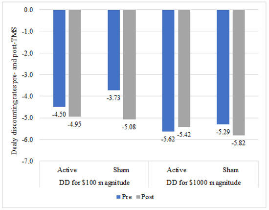 Pre- and post-TMS intervention delay discounting values by condition.
