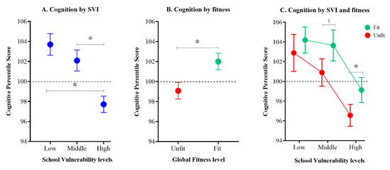 4.1. Independent and Combined Differences between Fitness, SVI, and Cognitive Performance