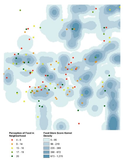 To illustrate how individual characteristics were combined with GIS-based food store scores, Figure 1 highlights anonymized participant location colored by perception of food in their neighborhood overlaid on a KDE surface of objective healthy food access. For each food access metric, scores were extracted from the corresponding geographic layer and appended to the individual’s home location.