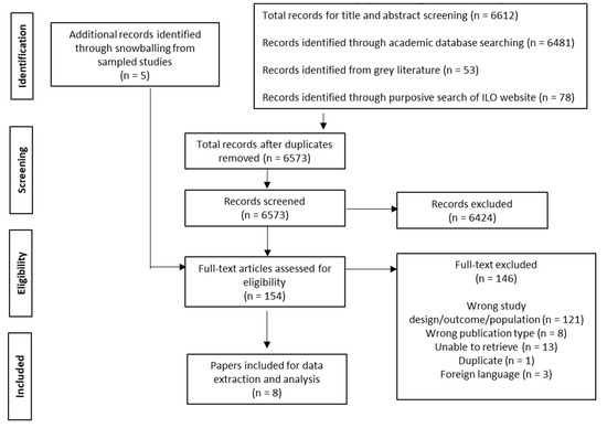 The study selection process is summarised in Figure 1. We identified 6612 articles from the academic databases, grey literature, and ILO website searches. Following deduplication, a total of 6573 articles were screened for eligibility. These were divided between three reviewers (C.W.C., N.S.P., and N.K.) who screened the titles and abstracts against inclusion criteria as per our PROSPERO protocol [33]. Of these, 149 progressed to full-text screening. A further five snowballed studies were included, resulting in 154 articles undergoing full-text screening by three reviewers (C.W.C., N.S.P., and N.K.). Eight articles were assessed to meet our inclusion criteria. All included papers were published in English.