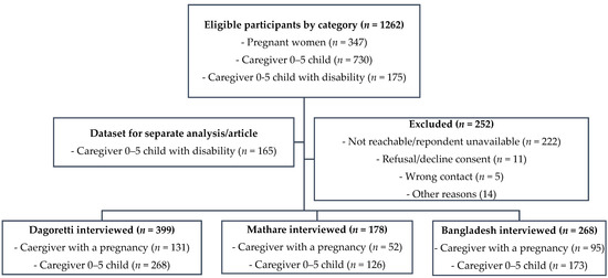 Non-probability and purposive sampling approaches were used in this study. Through consultations with the sub-county community health focal persons, we identified 56 community health units with households of low socio-economic status in the three informal settlements. Community health volunteers (CHVs) from these community units were involved to support with identification of households meeting eligibility criteria, and the sample summary and recruitment status by site is illustrated in Figure 1. The survey inclusion criteria included having a child below five years (with or without disabilities), being currently pregnant, above 18 years, and a resident of these informal settlements. A decline to provide informed consent was the only exclusion criteria. Analysis of data from caregivers of young children below five years with disabilities (n = 165) is reported in a separate manuscript, since this group experiences multiple vulnerabilities that would require in-depth exploration and discussion.