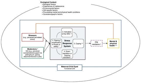 The HAI–HPA Transactional Model provides a useful framework for how HAI may influence perinatal mental health outcomes via the stress-response system. However, it is centered on evidence and characteristics of short-term animal-assisted interventions for individuals rather than the unique characteristics of HAI involving household pets within the family system. Moreover, this model does not adequately attend to the role of social context in shaping relationships with animals and responses to HAI. We are unaware of any contemporary model that accounts for the biobehavioral benefits and risks of pet ownership and related HAI with the goal of identifying the mechanisms through which HAI shapes mental health.
