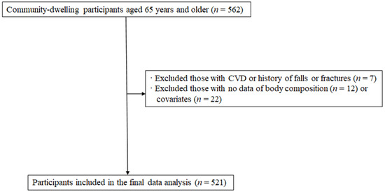 Figure 1 presents a flowchart of study participants. In a cross-sectional study design, we initially recruited 562 participants aged 65 years and older (mean age 74.1 ± 6.2 years) from local community centers in the city of Suwon, Republic of Korea, between February 2017 and October 2019. We then excluded the following: people who had CVD or a history of recurrent falls or fractures in previous years (n = 7) or no DXA-based body composition data (n = 12). Additionally, we also excluded those who had no data of covariates (n = 22). The remaining 521 participants were included in the final data analyses. Sample size was calculated on the basis of our preliminary study. Using an expected correlation coefficient of 0.14, we calculated that a sample size of 540 will be required at an α level of 0.05 and β level of 0.85, with the assumption of approximately 20% dropout rate (G*Power v3.1). The appropriate institutional review board reviewed and approved the study (approval no. SKKU 2018-06-005-003) in accordance with the Declaration of Helsinki. Written informed consent was obtained from all participants prior to their participation.